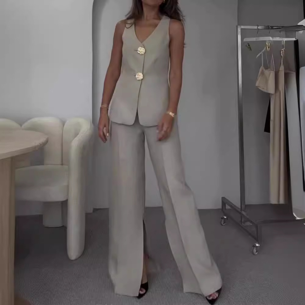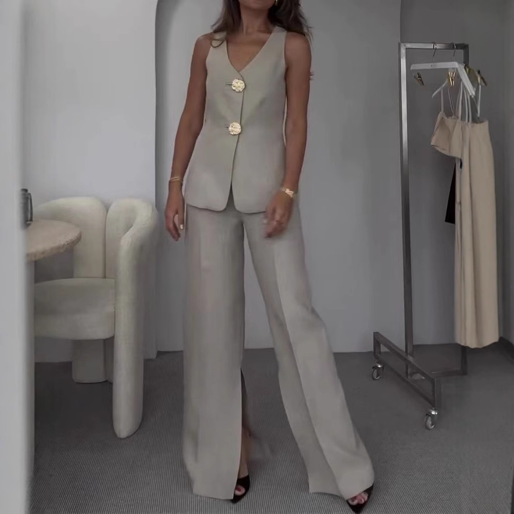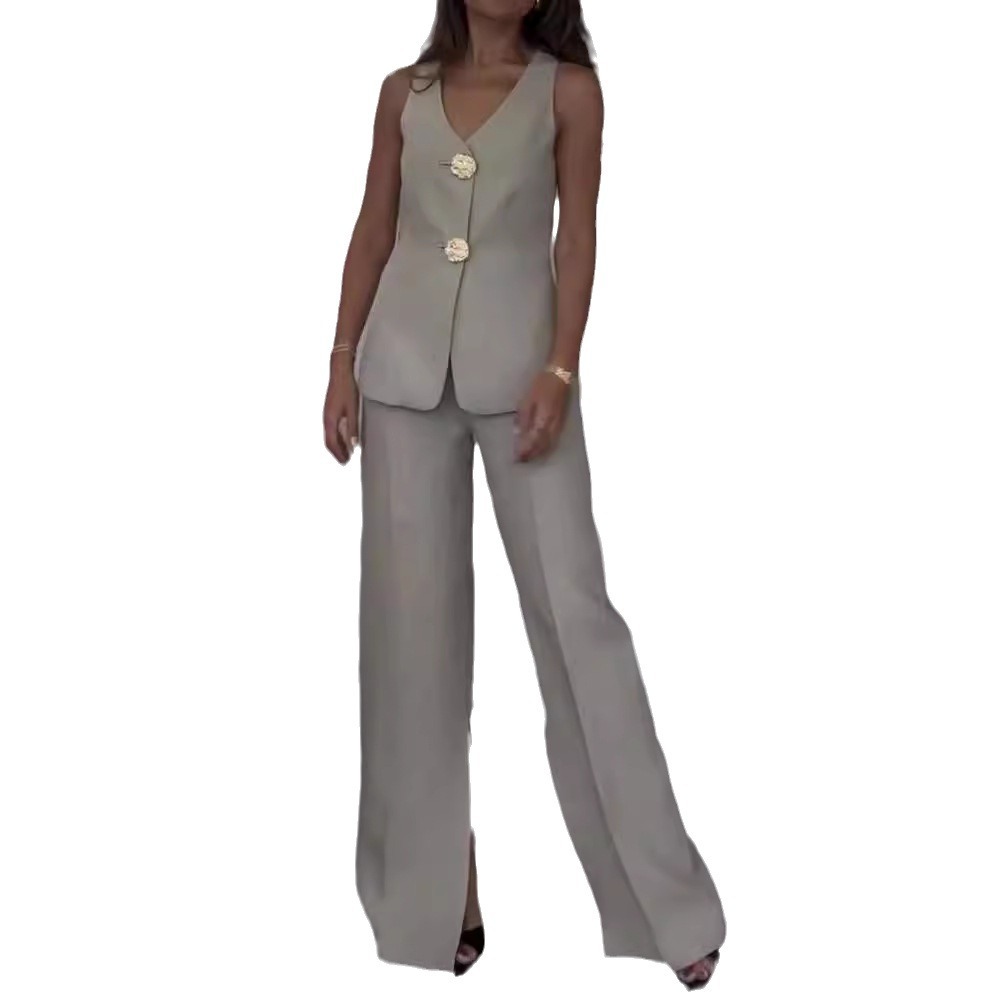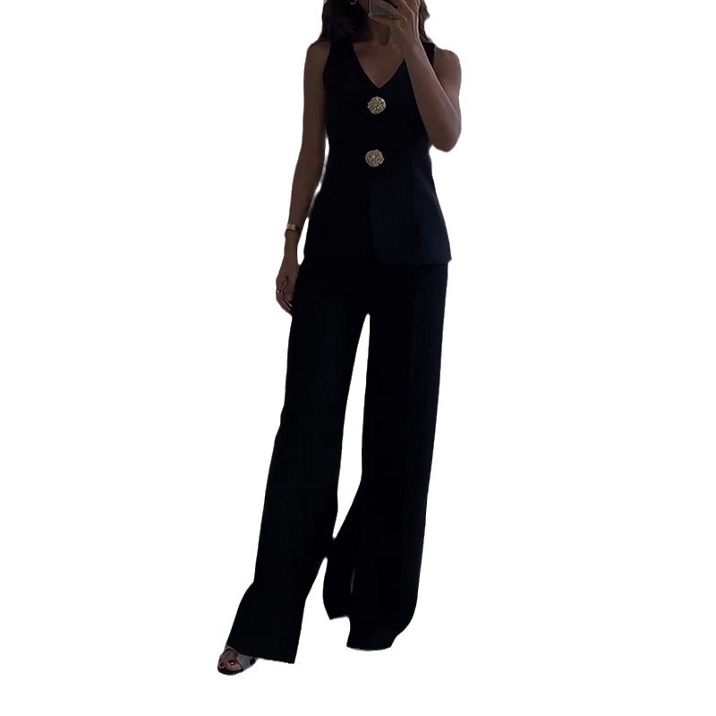 Uveng Uveng Spring And Summer New Solid Color V-Neck Sleeveless Vest Wide Leg Pants Casual Two-Piece Set