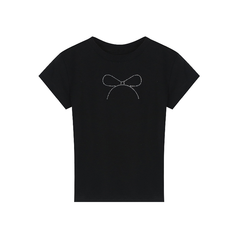 Uveng Uveng Summer Hot Girls Short Sleeve T-Shirt Women's Crop Black Bow Hot Diamond Slim Short Top Tide