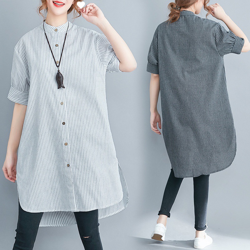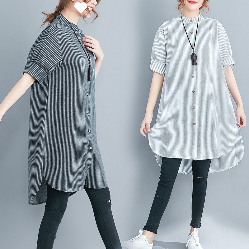 Uveng Uveng Summer New Cotton Lint Style Loose Large-Size Striped Shirt Women Long-Term Collar Shirt