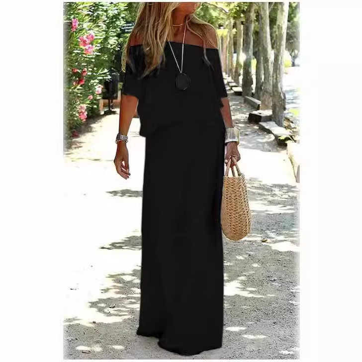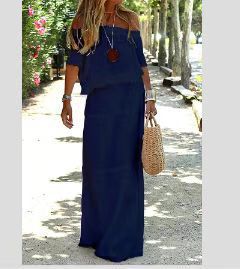 Uveng Uveng Summer New Fashion Casual Shoulder Tight Waist Short Sleeve Loose Long Dress