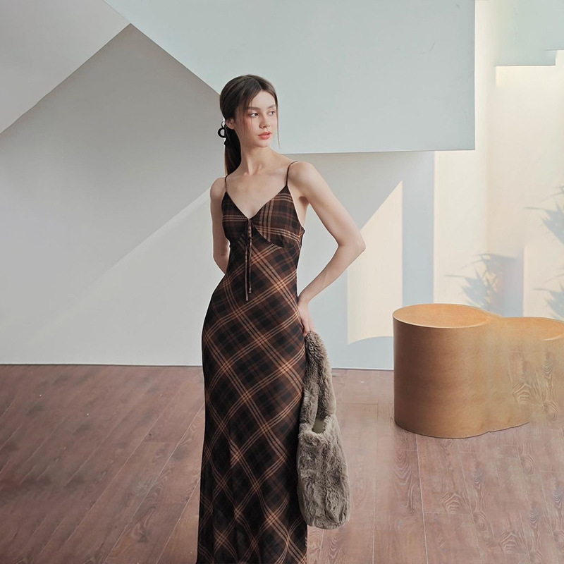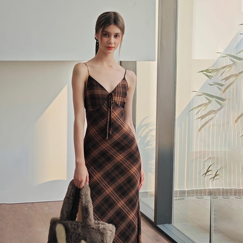 Uveng Uveng Summer New Fashion Retro Plaid Pure Desire Socialite Temperament Slim Condole Belt Dress Female