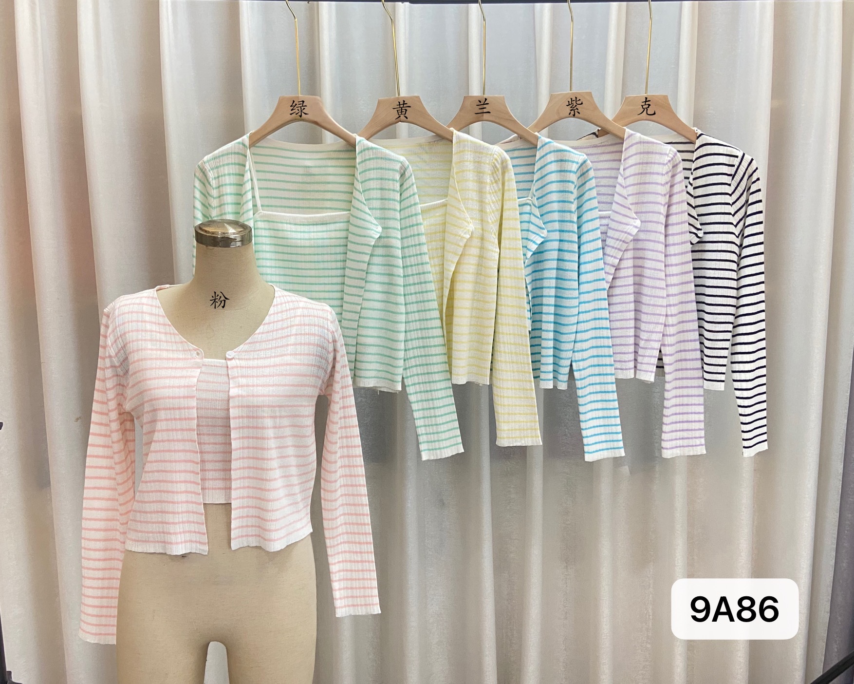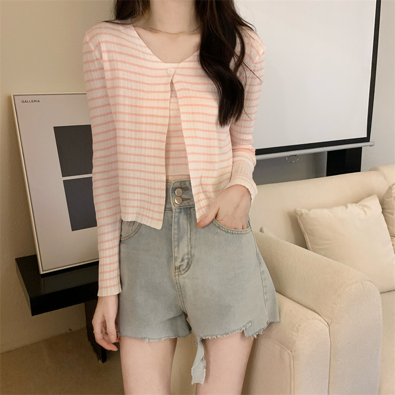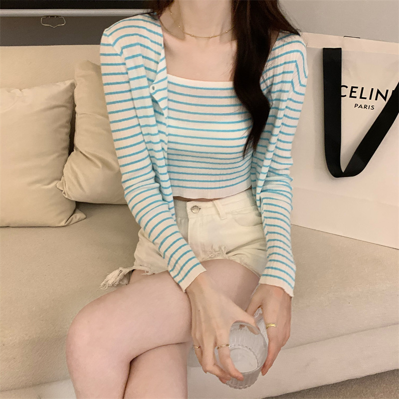 Uveng Uveng Summer New Fashion Temperament Sexy Knitted Striped High-Waisted Sling + Long-Sleeved Open-Shirt Two Sets