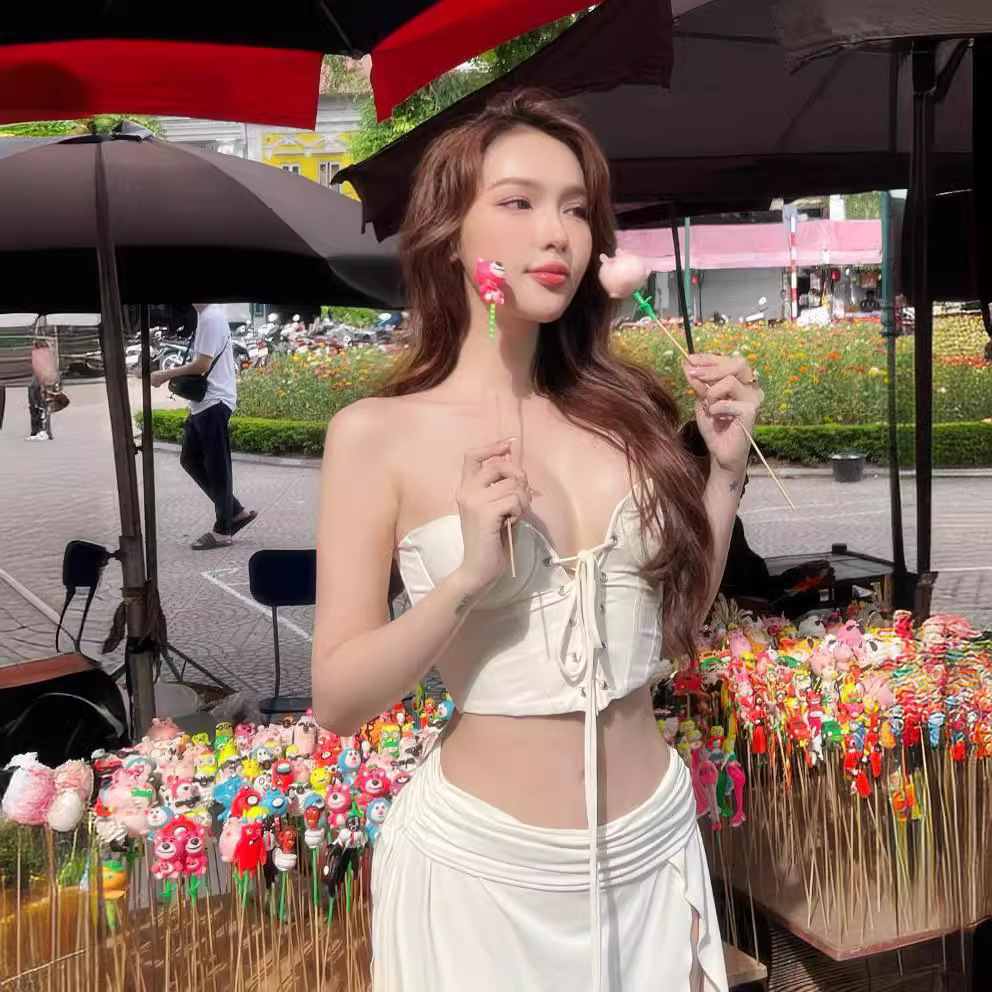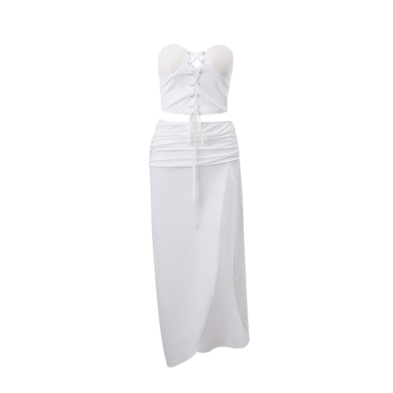 Uveng Uveng Summer New Sexy Crop Wrapped Chest Strap Vest Pleated Low Waist Slit Skirt Suit
