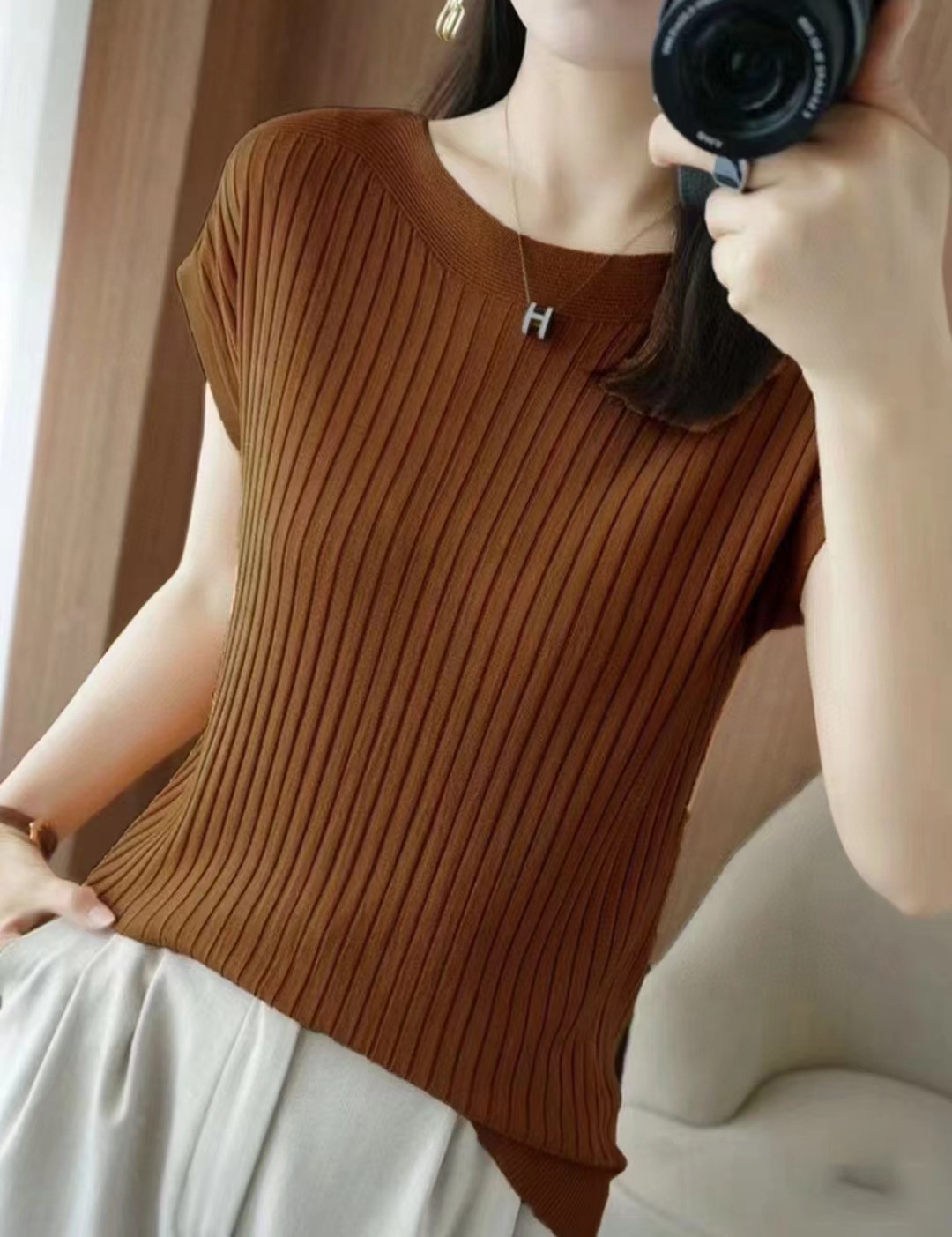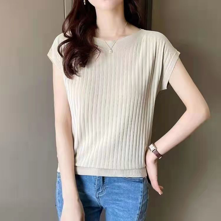 Uveng Uveng Temperament Bat Sleeve Short-Sleeved T-Shirt For Women's 2024 Summer Wear New Black Ice Silk Knitted Shirt Loose Word Collar Top