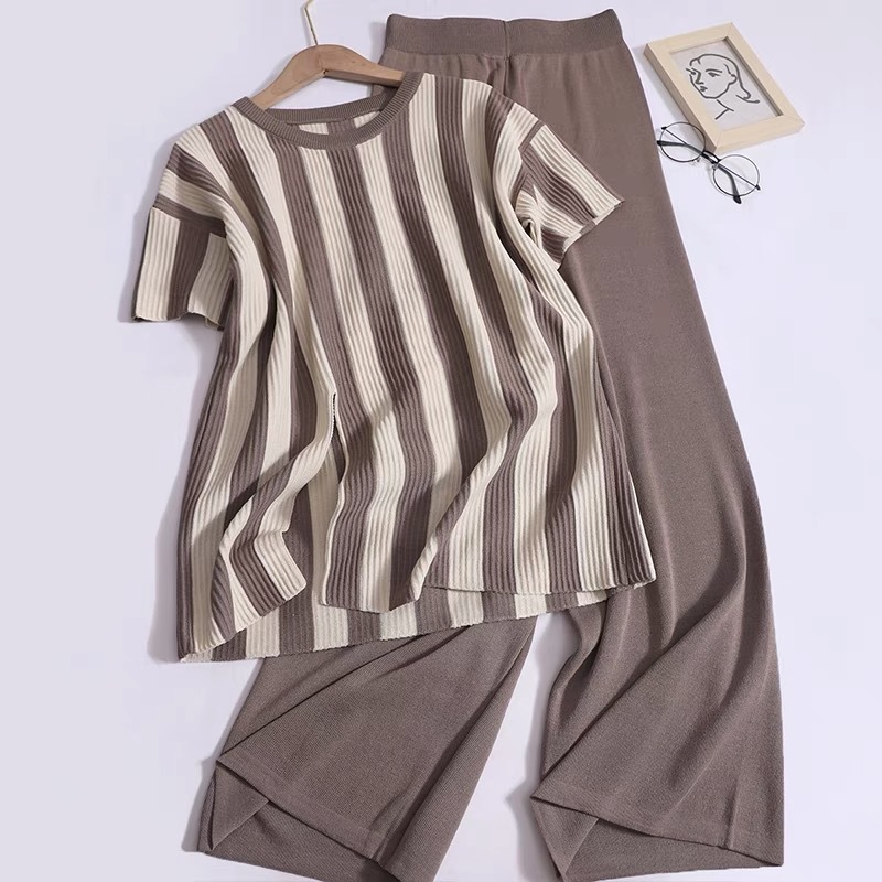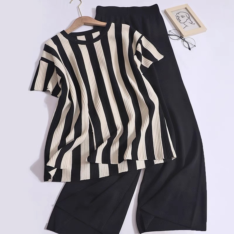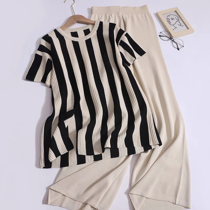 Uveng Uveng Temperament Famous Knitted Fashion Suit Round Collar Vertical Fork Short Sleeve Top + High-Waisted Solid Trousers Woman