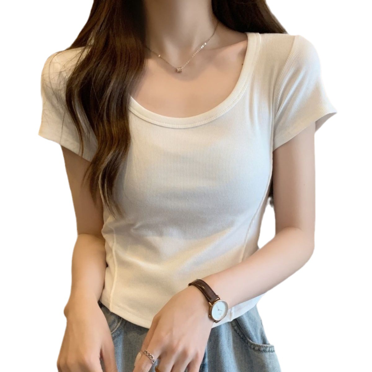 Uveng Uveng U Collar Short-Sleeved T-Shirt Women 2023 Summer New Korean Version Slim High Waist Short Style Students Pure Color Jacket Tide