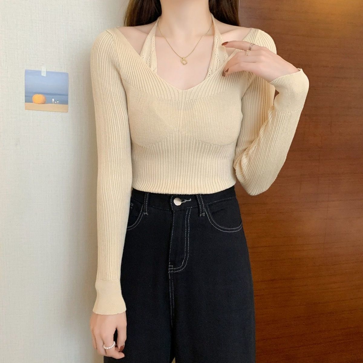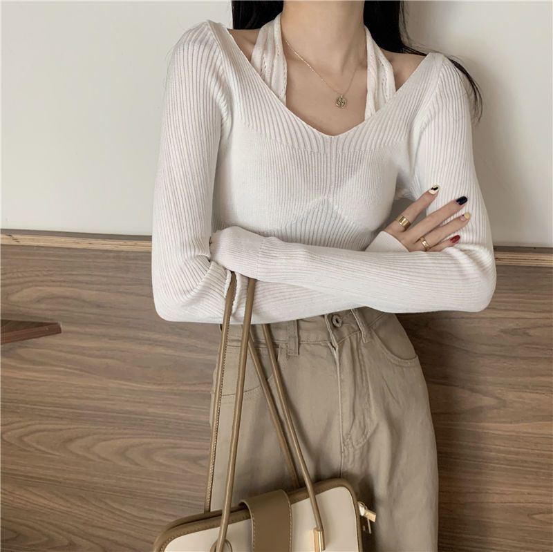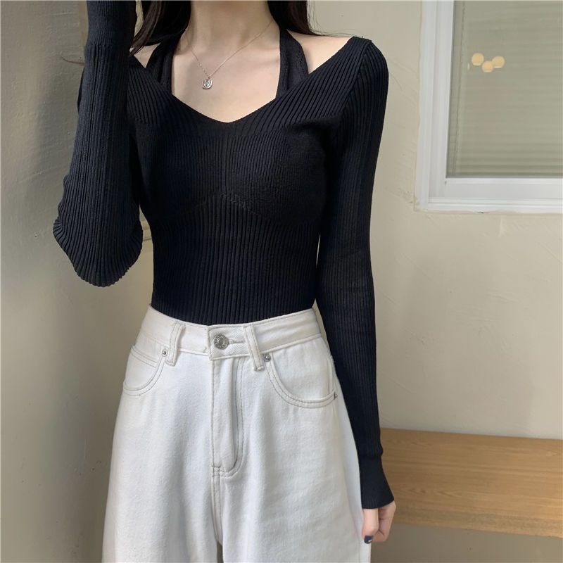Uveng Uveng Up Spring And Autumn New Chic Sexy Chest Thin Hanging Neck Two Long-Sleeved Knitted Jersey Jersey Elastic Sweater