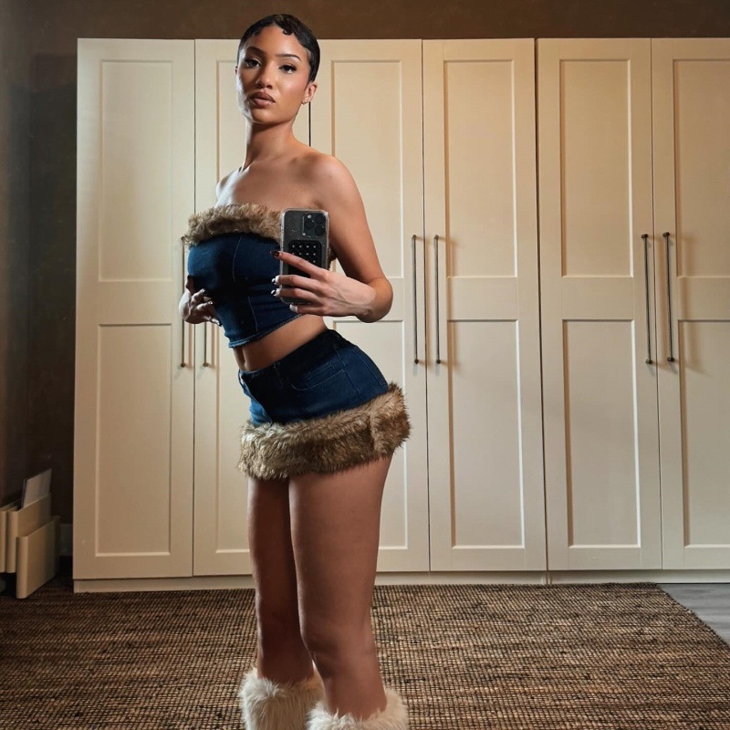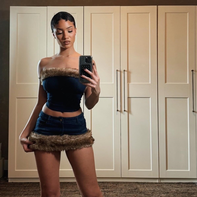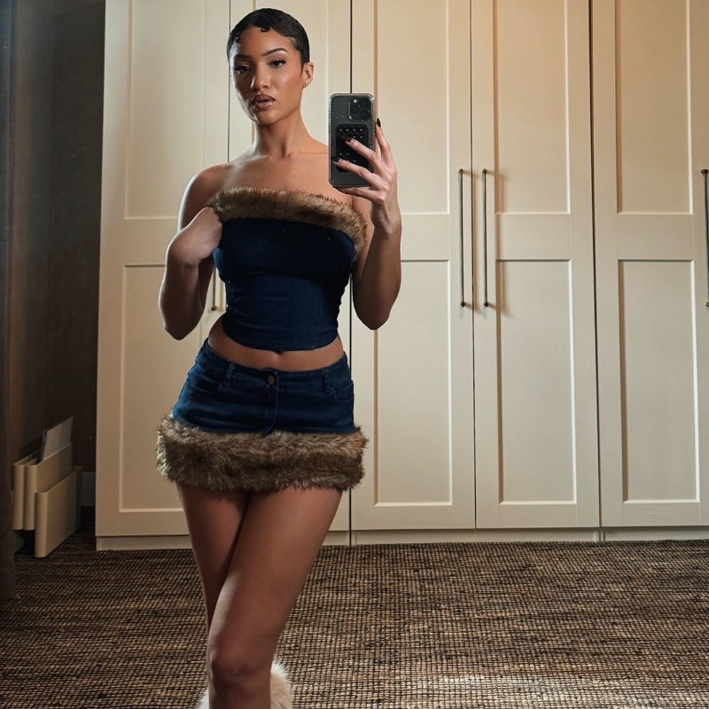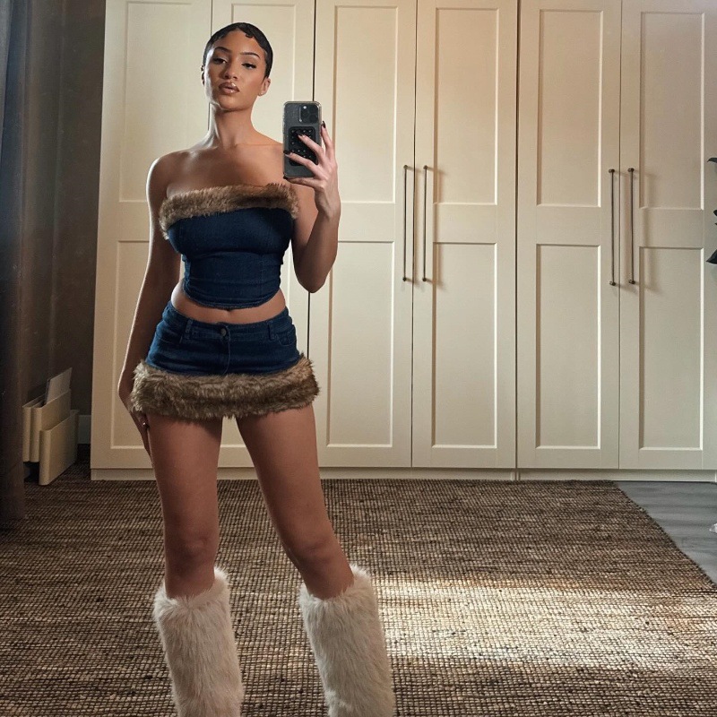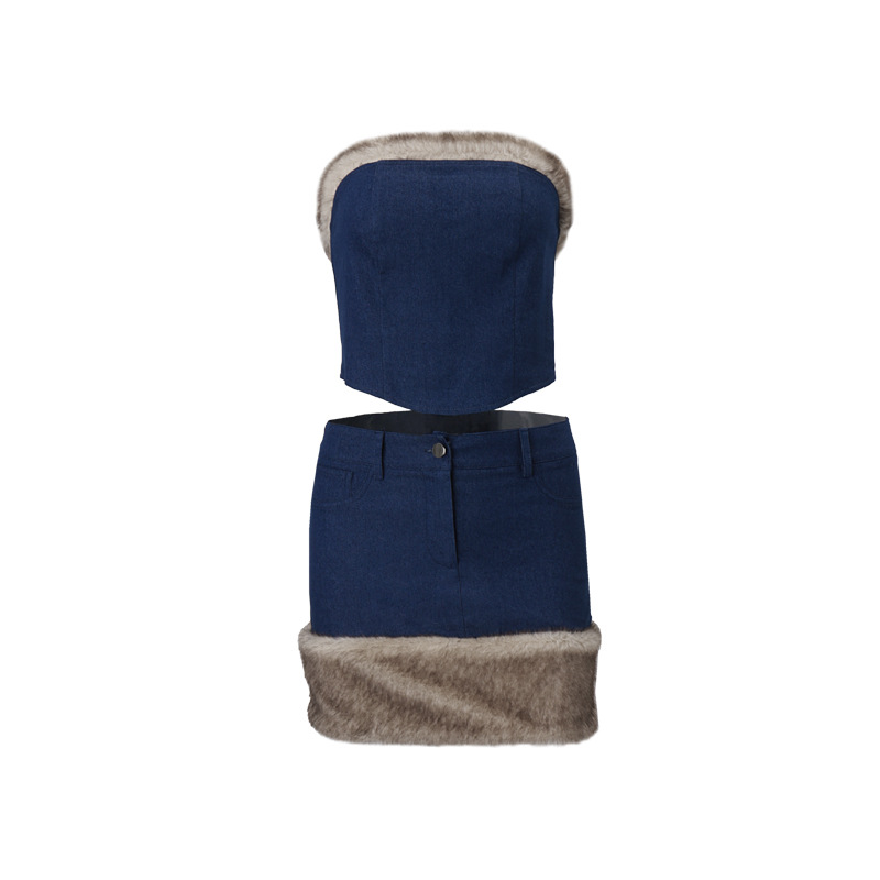 Uveng Uveng Winter New Fashion Sexy Hot Girl Retro Fur Denim Strapless Top Wrapped Buttock Skirt Suit Girl