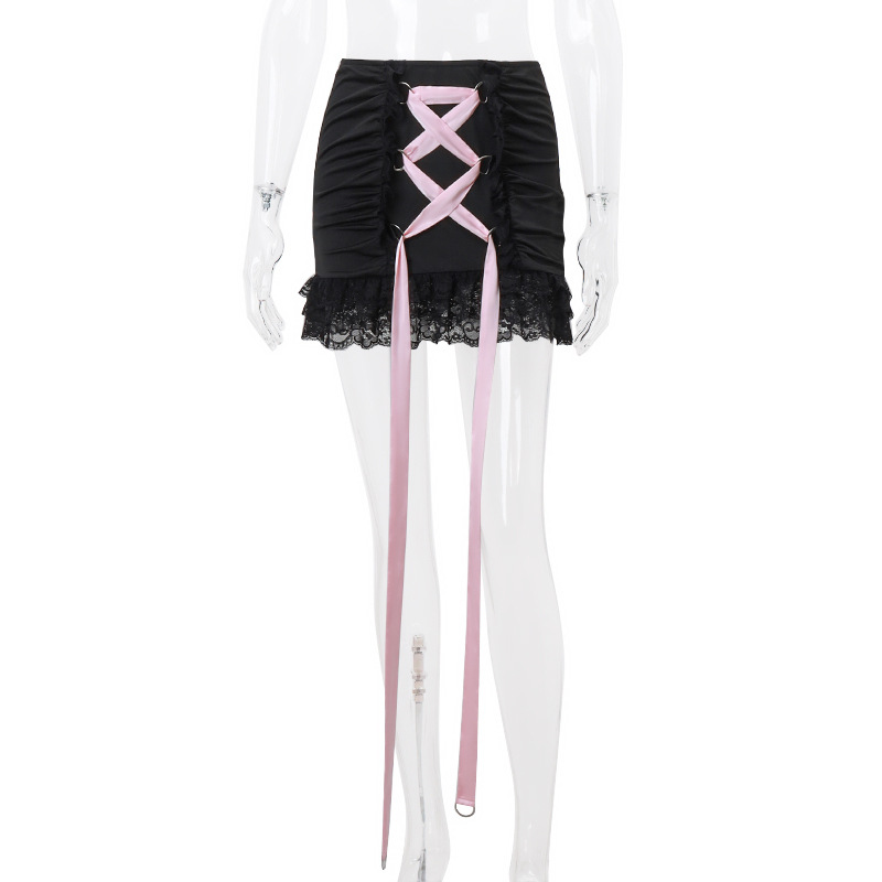 Uveng Uveng Winter New Ins Pure Desire Hot Girl Lace With Long Sleeve Top Lace Splicing Package Buttock Skirt Suit Female