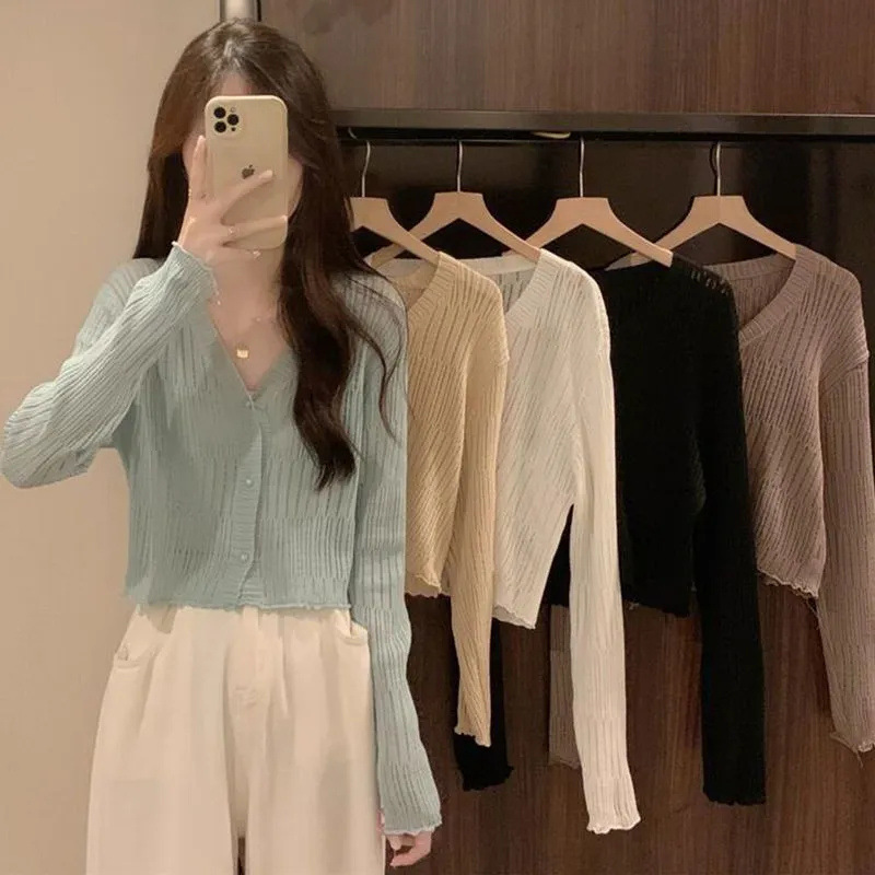 Uveng Uveng Women's Thin Outer Summer 2023 New Long-Sleeved V-Neck Coat Sunscreen Short Knitted Early Autumn Coat Ins