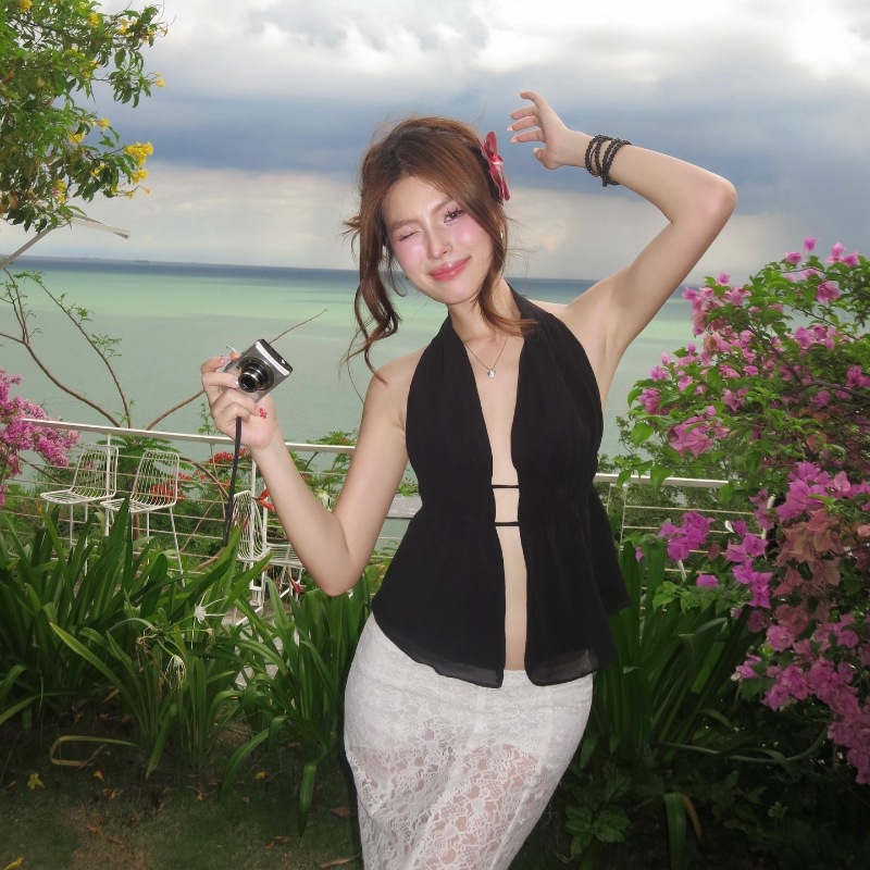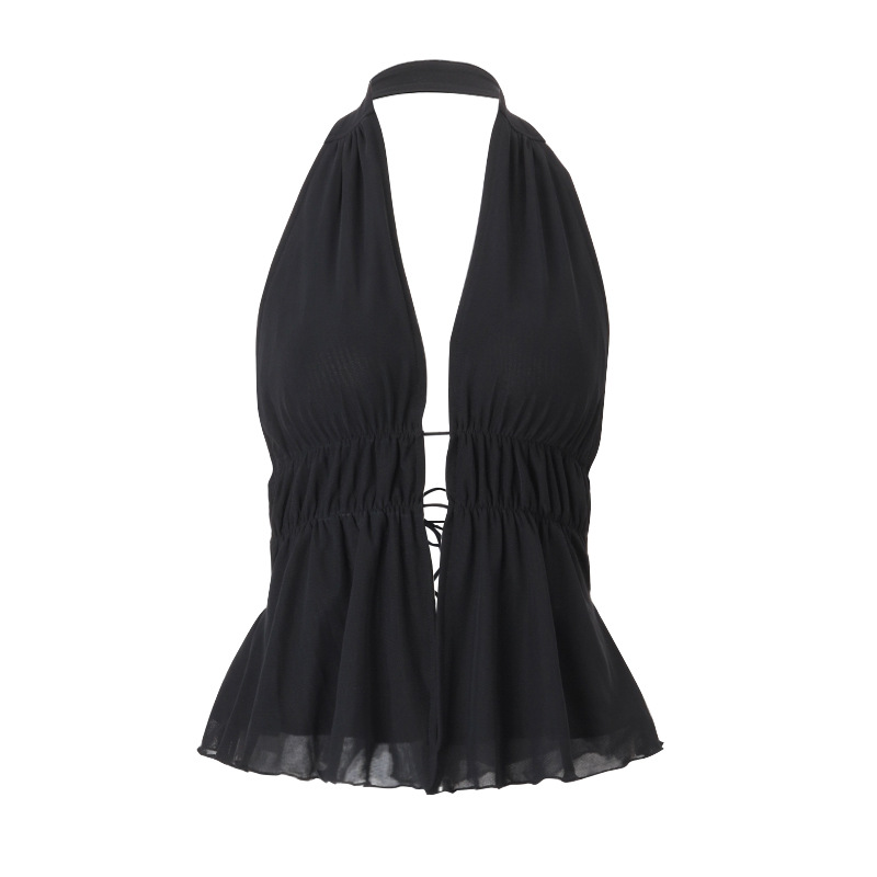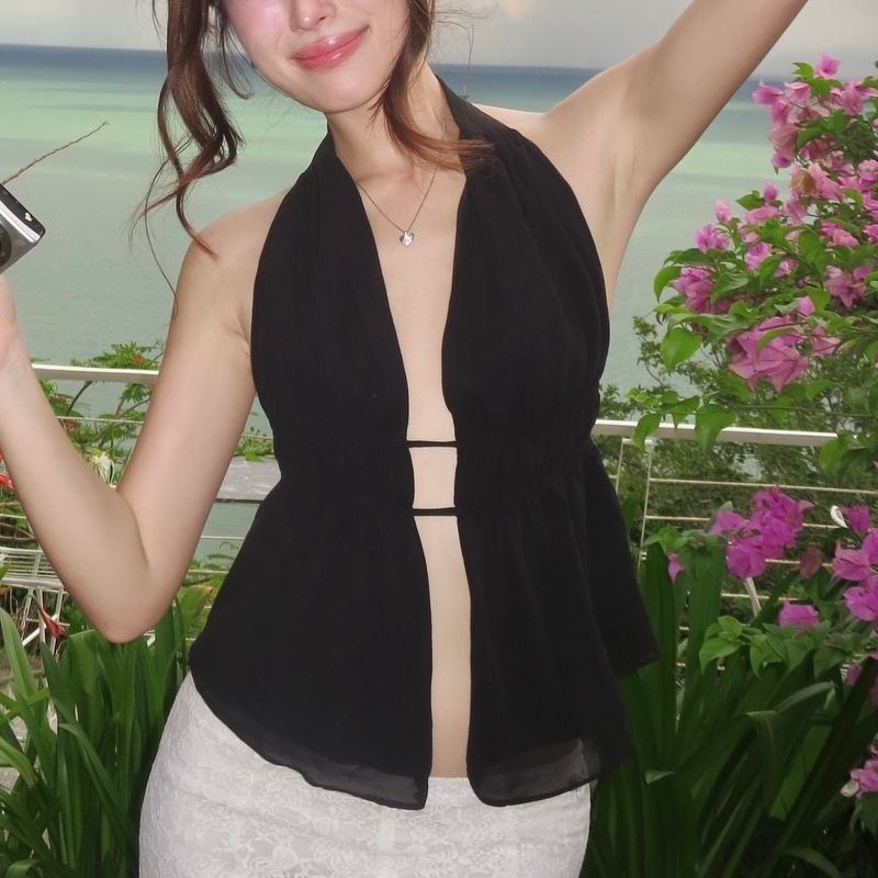 Uveng Uveng Women's Wear 2024 Summer New Fashion Sexy Solid Color Back Strap Hollow Out Slim Neck Top