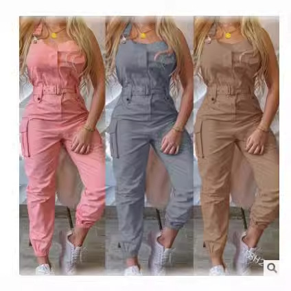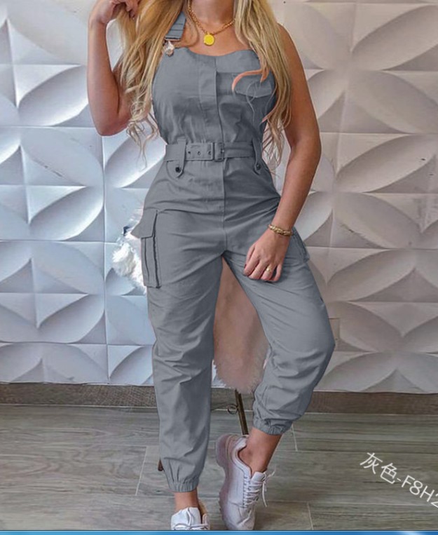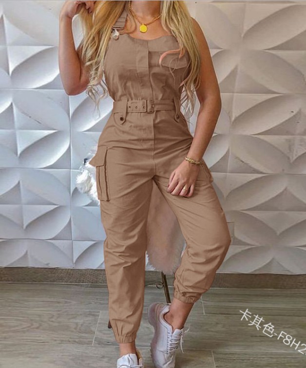 Uveng Uveng Women's Work-Packed Pocket Design Jumpsuit Sleeveless Backs And Trousers Simple Restraints Trousers + Belts