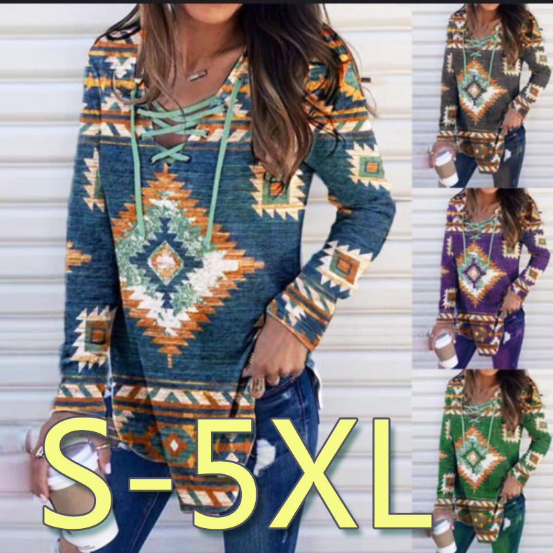 Autumn V-neck Lace Printing Printed Long Sleeve Women's Pullover