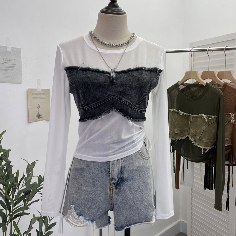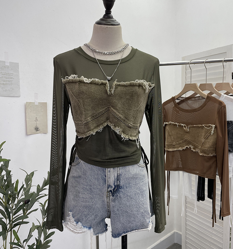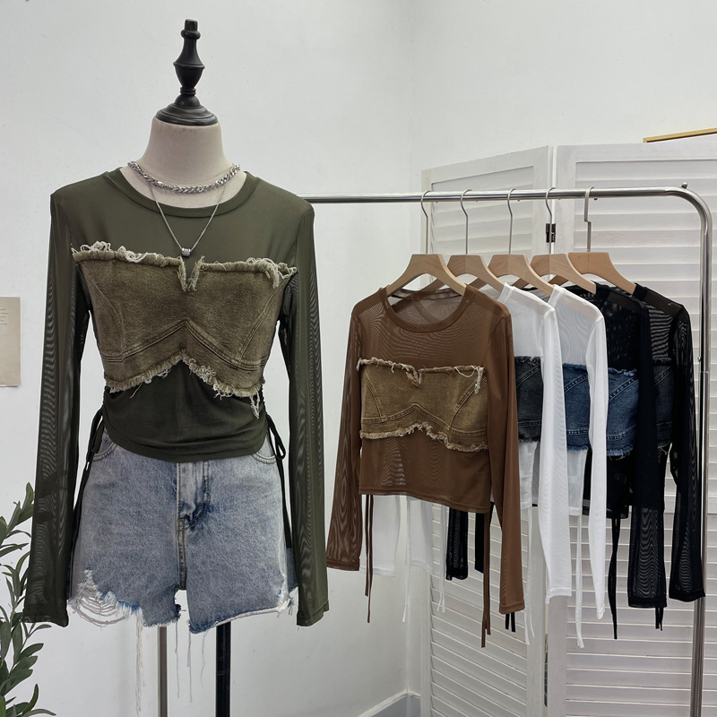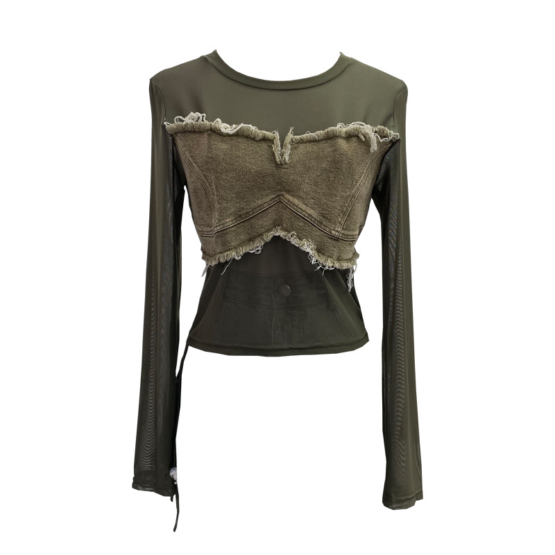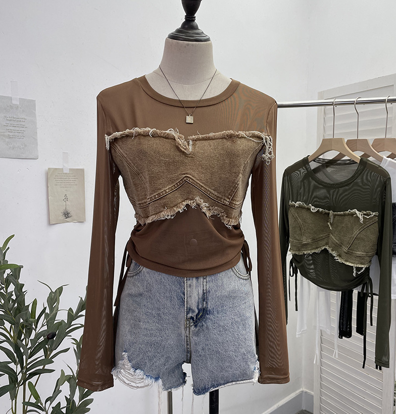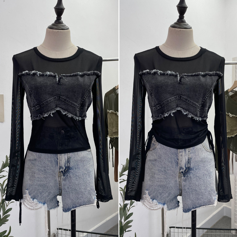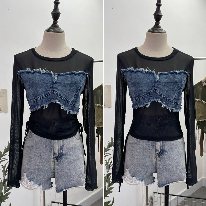 Uveng Vintage Spice Girls Stomee Net Yarn Sexy Perspective Drawstring Long-Sleeved T-Shirt Top 2630