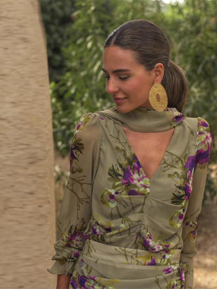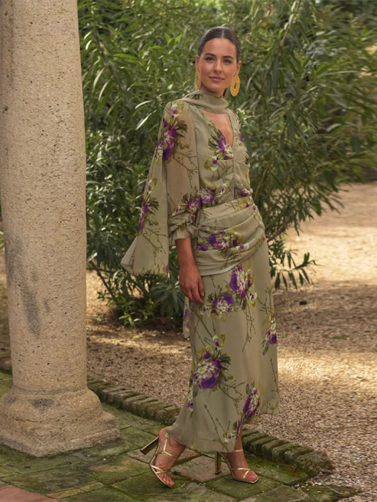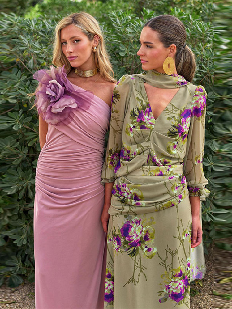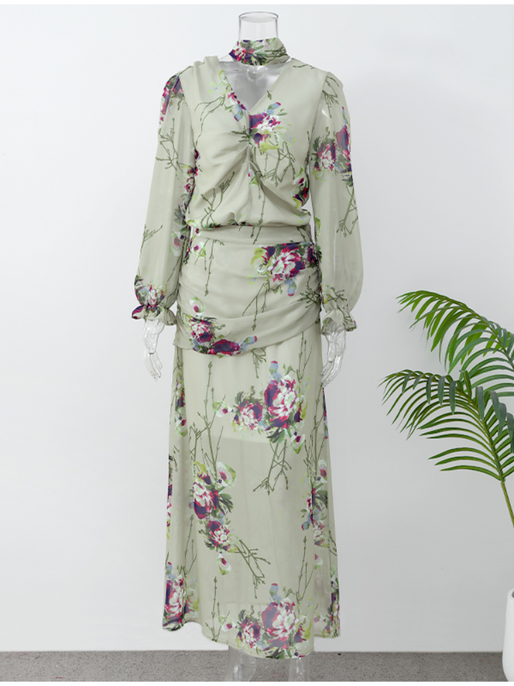 Uveng Women Elegant Flower Printed Gauze Pleated Dress Suits Chic V Neck Full Sleeved Top High Waist Long Dresses Set Lady Party Wear 413-0