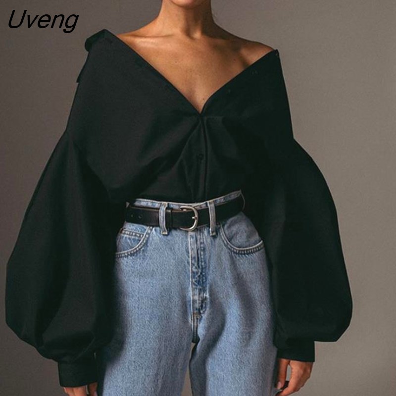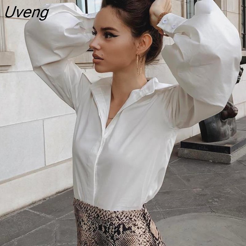 Uveng Women Lantern Sleeve Casual Vintage Sexy Button White Blouse Plus Size Loose Women Shirt Cotton Office Ladies Tops Blusas 10903
