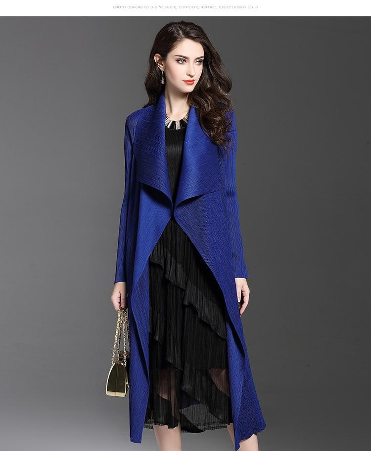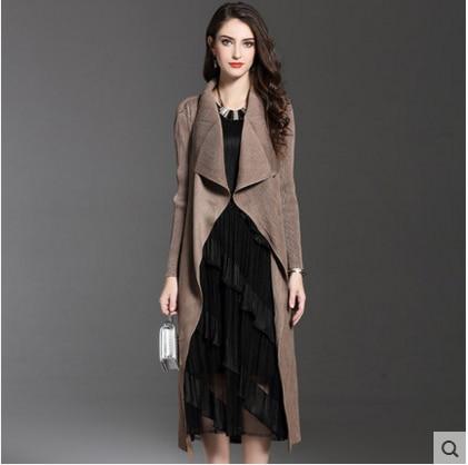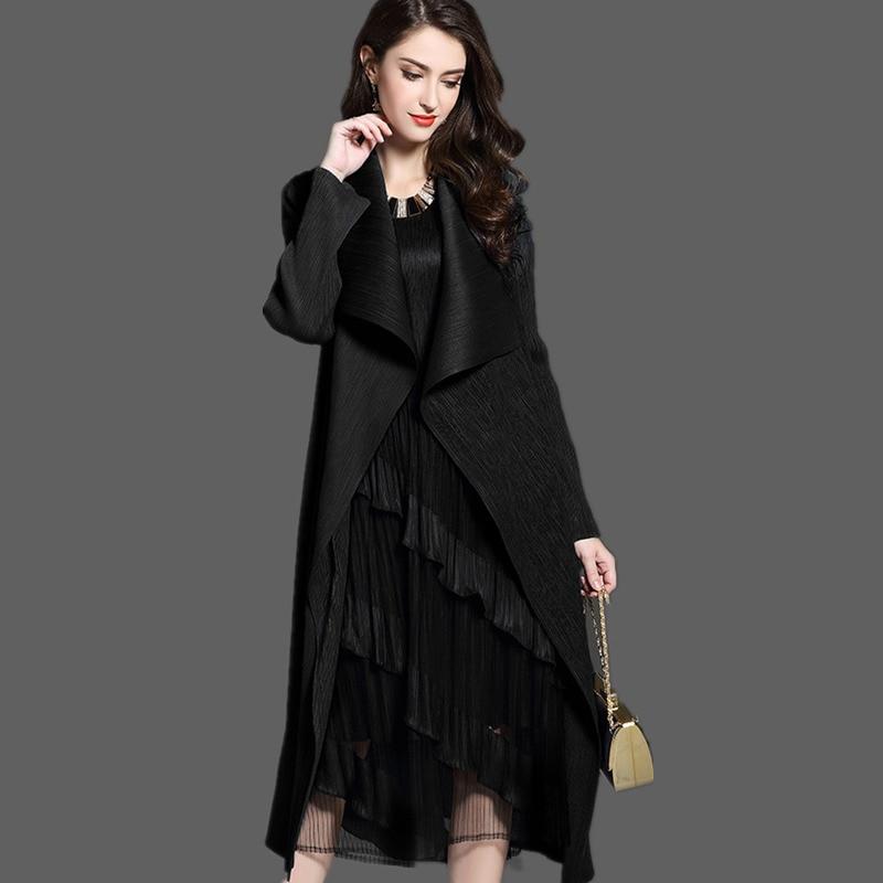 Women Fashion Pleated Long Windbreaker Turn Down Collar Open Cardigan Black Green Gray Red Khaki Female Clothing Coat Shawl